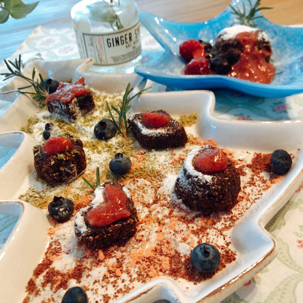 ※今回はクリスマス仕様に、空芯菜を乾燥させて作ったパウダーで緑を、ビーツパウダーとストロベリーパウダーで赤を、そして雪をイメージして、粉糖の代わりにグリーンバナナ粉を使用してみました。